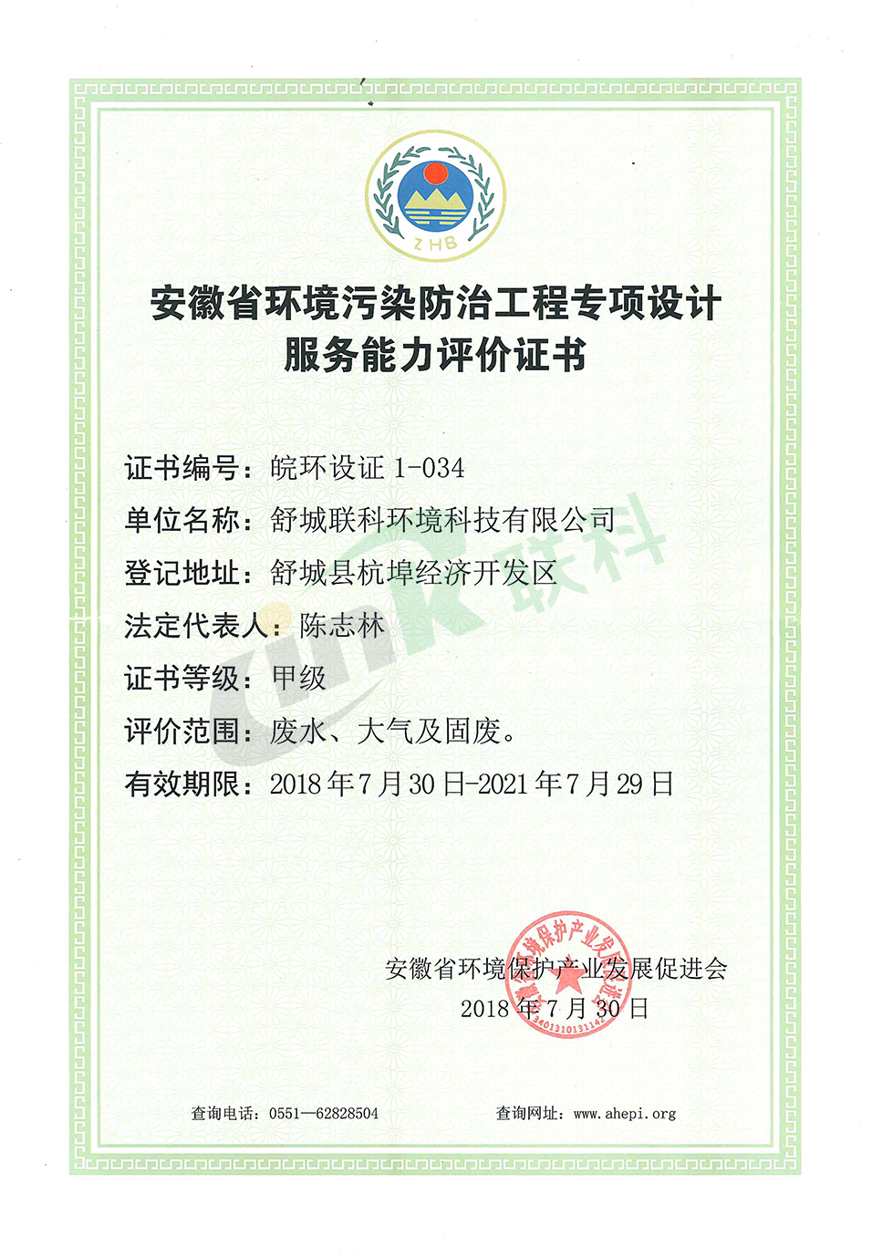 證書編號(hào):皖環(huán)設(shè)證1-034