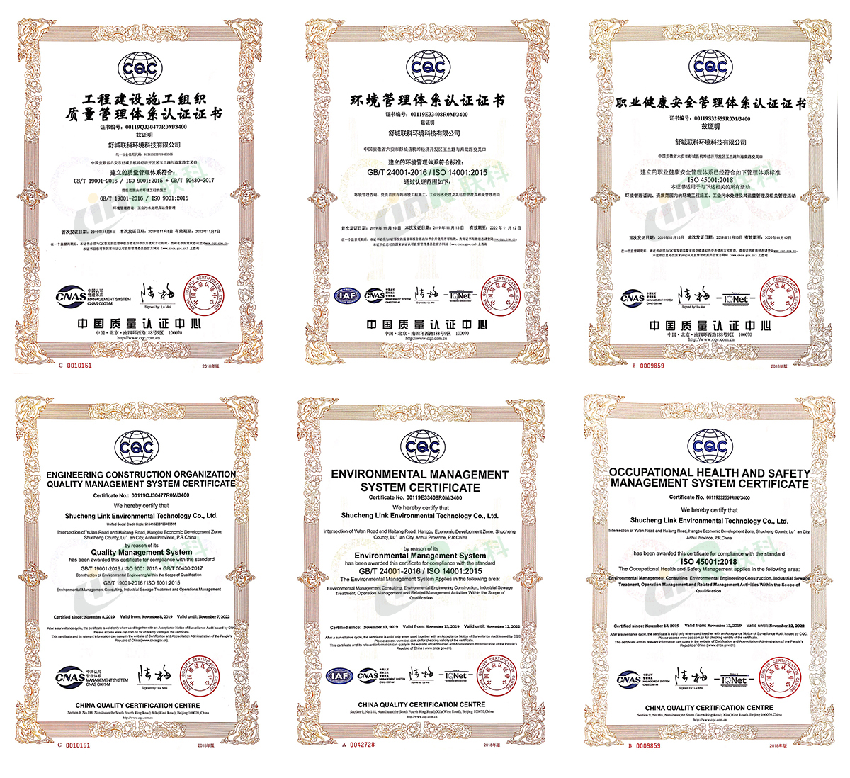 我公司于2019年11月13日取得由中國(guó)質(zhì)量認(rèn)證中心頒發(fā)的《工程建設(shè)施工組織質(zhì)量管理體系認(rèn)證證書(shū)》、《環(huán)境管理體系認(rèn)證證書(shū)》、《職業(yè)健康安全管理體系認(rèn)證證書(shū)》。
